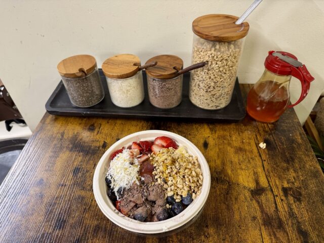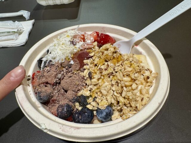 カカオニブ(ダークチョコレートのような)、ココナッツ、グラノーラ、ハチミツを好きなだけ盛ることができます。
