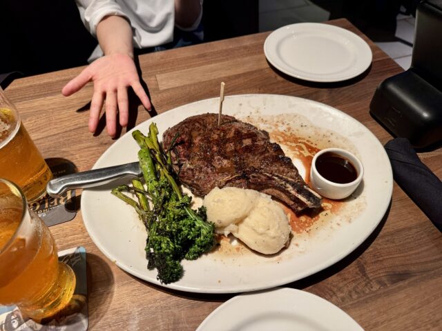 最終日なのでステーキを注文。約500gの巨大な骨付き肉。味付けはシンプルに塩コショウのみ(多分)